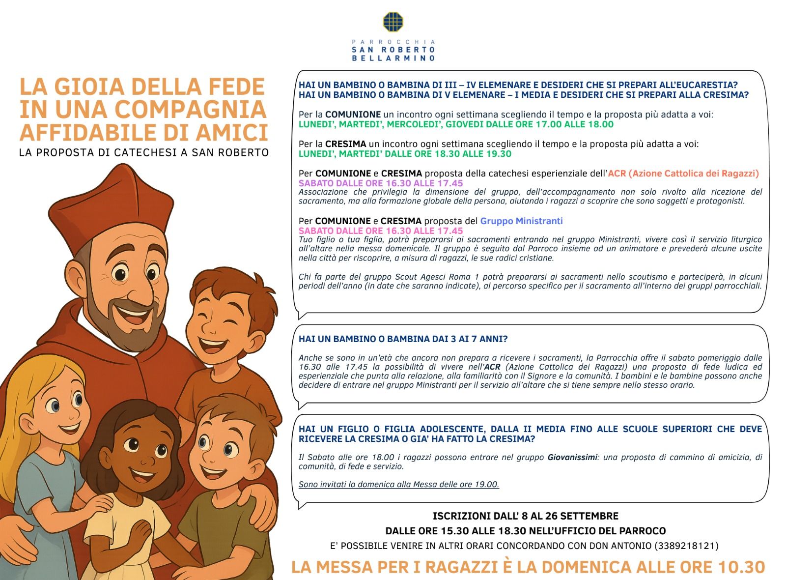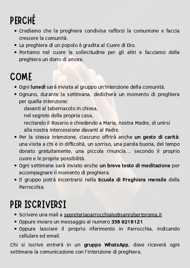 Nei mesi di Luglio e Agosto la Parrocchia apre alle ore 8.00 fino alle 13.00 e dalle 17.00 alle 20.00