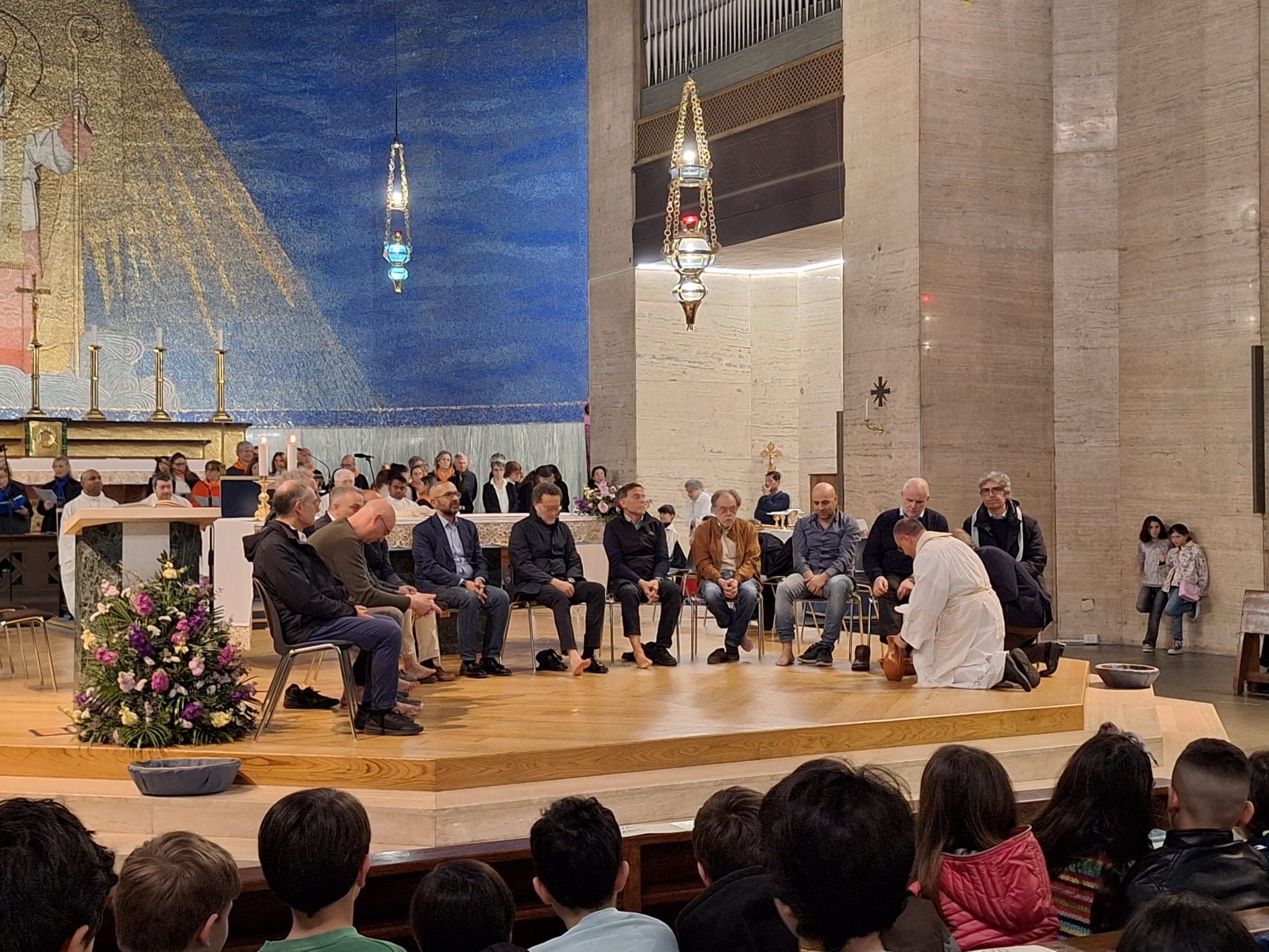 Che onore per me stasera avere la possibilità di ricevere la vostra testimonianza: questa parrocchia è bellissima perché il Signore mi ha regalato persone che hanno voglia di credere in Lui. Ho l’onore di lavare i piedi a dodici papà che rappresentano tutta la comunità e che esprimono quella nota della paternità con cui ho voluto in questi anni impostare la vita della nostra parrocchia: laddove anche io personalmente sono stato messo alla prova proprio nel perdere il padre sulla terra, ho cominciato a dover imparare, senza tanti strumenti, cosa volesse dire essere chiamato ad essere segno per una parrocchia della paternità di Dio. Nel lavare i piedi di dodici papà è per me e per tutti noi stasera la possibilità di dire grazie perché siamo figli, nel lavare i piedi di dodici papà e dire grazie a Te, Signore, perché sei padre, è dire grazie per il modo in cui sei Padre nella nostra vita, per come abbiamo riconosciuto la tua paternità nei sentieri lineari e tortuosi della nostra storia. Mi inginocchio davanti ai piedi di un padre perché sono piedi che pulsano di vita: mi fanno pensare ai piedi di Dio nel giardino che si mette in cammino a cercare il figlio lontano per il peccato: “Adamo, dove sei?”, assomigliano ai piedi del padre Abramo che cammina verso il monte dove deve sacrificare il figlio… sono i piedi che portano il peso della tensione, della paura per il futuro dei figli, sono i piedi che devono camminare da soli e nessuno può capire fino in fondo la solitudine di un papà, sono i piedi di chi corre ad annunciare notizie belle, sono i piedi di chi deve correre più veloce del mondo per arrivare in tempo e togliere ai figli una mentalità di egoismo e correre ad arrivare per primi per dare ai figli la ricchezza di quel Vangelo, di chi corre per non lasciare che il mondo rubi i figli, lasciandoli senza Dio, sono i piedi del padre misericordioso che corre ad abbracciare il figlio che ha sbagliato e che sa sempre dare nella propria casa misericordia, sono i piedi sicuri e fermi come quelli di San Giuseppe che, con il passo certo della fede, custodiscono e proteggono…. Insomma nei piedi dei nostri papà ci leggo tutta questa ricchezza e così mi sento onorato di inginocchiarmi davanti a loro. Il rito prevede anche che il sacerdote baci il piede appena asciugato: vorrei che ogni papà e mamma, nonni o nonne presenti qui stasera sentano il bacio grato di Dio, sentite la gratitudine di Dio per ciò che siete e vorrei anche io dirvi grazie per l’esempio che in queste mura date: vi ringrazio per come siete genitori. Questo bacio sia il segno della gratitudine di Dio per la rettitudine, la limpidezza con cui cercate di portare avanti le vostre famiglie. Sia un segno che doni coraggio, sì, “coraggio, andate avanti a costruire famiglie belle, sane; coraggio andate avanti anche se feriti, anche se soli… la vostra rettitudine è il tesoro più bello che potete lasciare ai vostri figli e la testimonianza che arricchisce anche questa comunità. Signore, toglici pure tutto mai l’amicizia con Te e la rettitudine del cuore con cui facciamo le cose. L’Eucarestia stasera ci faccia a tutti questa grazia: amicizia con Gesù e rettitudine del cuore.